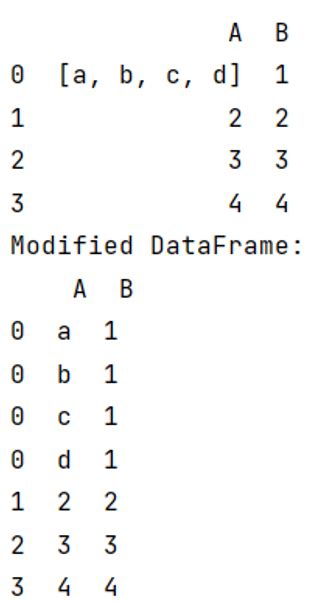 Successful [1]: df = pd.DataFrame({'A': [[zero, 1, 2], 'foo', [], [three, four]], ...: 'B': 1, ...: 'C': [['a', 'b', 'c'], np.nan, [], ['d', 'e']]}) Successful [2]: df Retired[2]: A B C zero [zero, 1, 2] 1 [a, b, c] 1 foo 1 NaN 2 [] 1 [] three [three, four] 1 [d, e] Successful [three]: df.detonate('A') Retired[three]: A B C zero zero 1 [a, b, c] zero 1 1 [a, b, c] zero 2 1 [a, b, c] 1 foo 1 NaN 2 NaN 1 [] three three 1 [d, e] three four 1 [d, e]